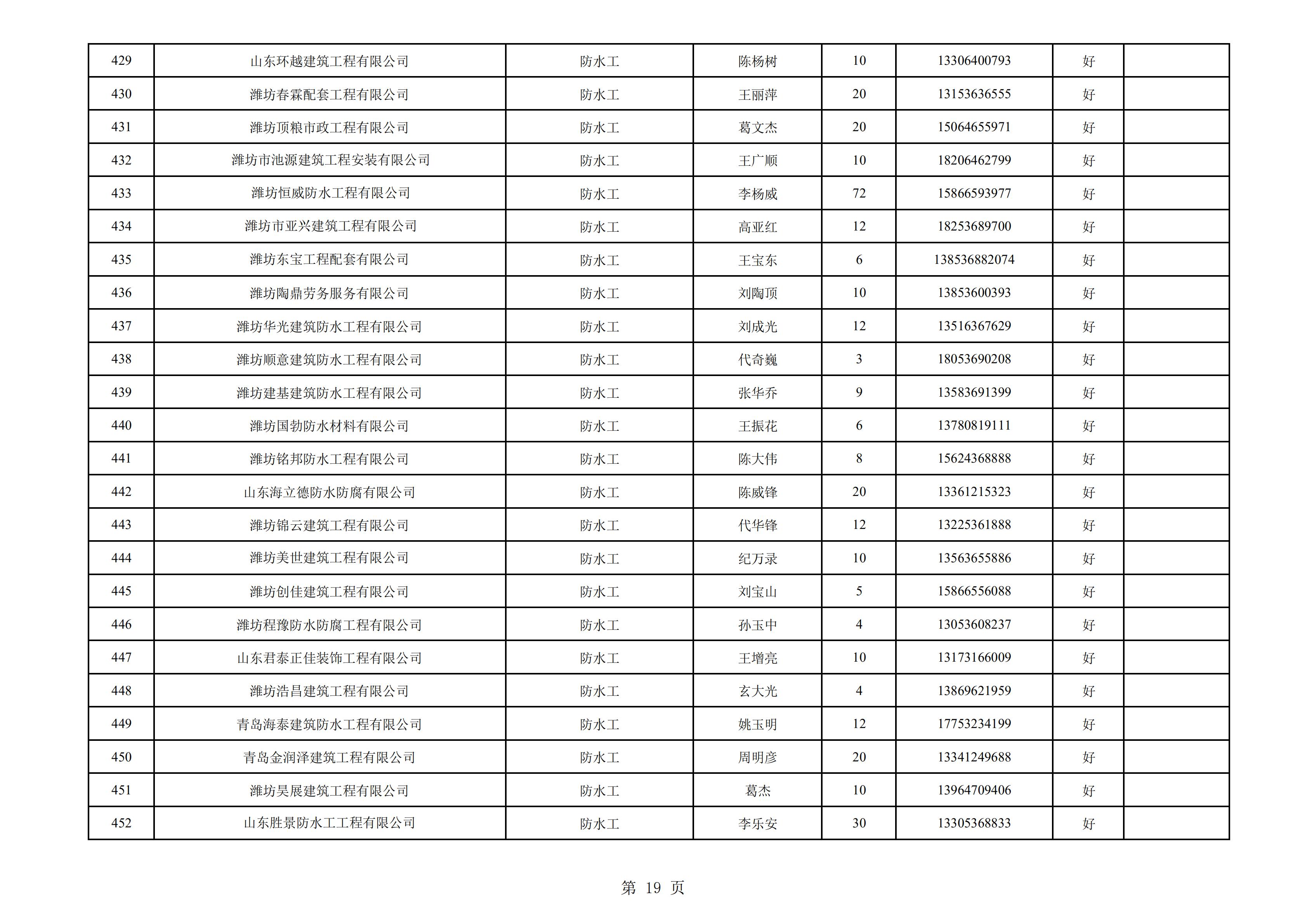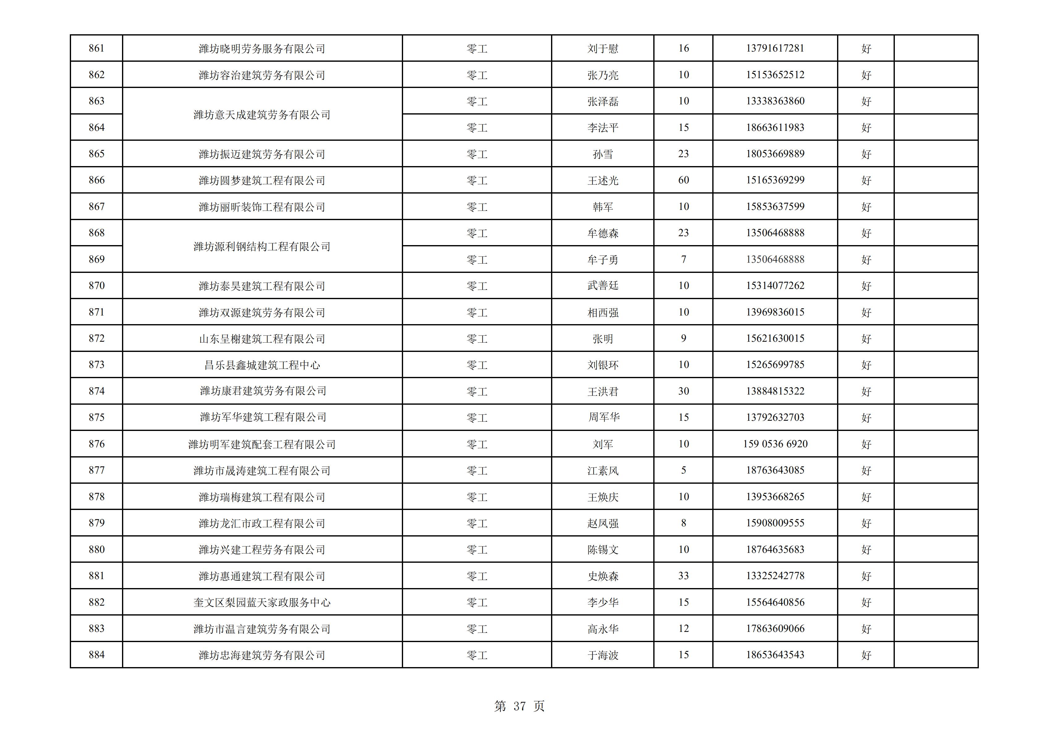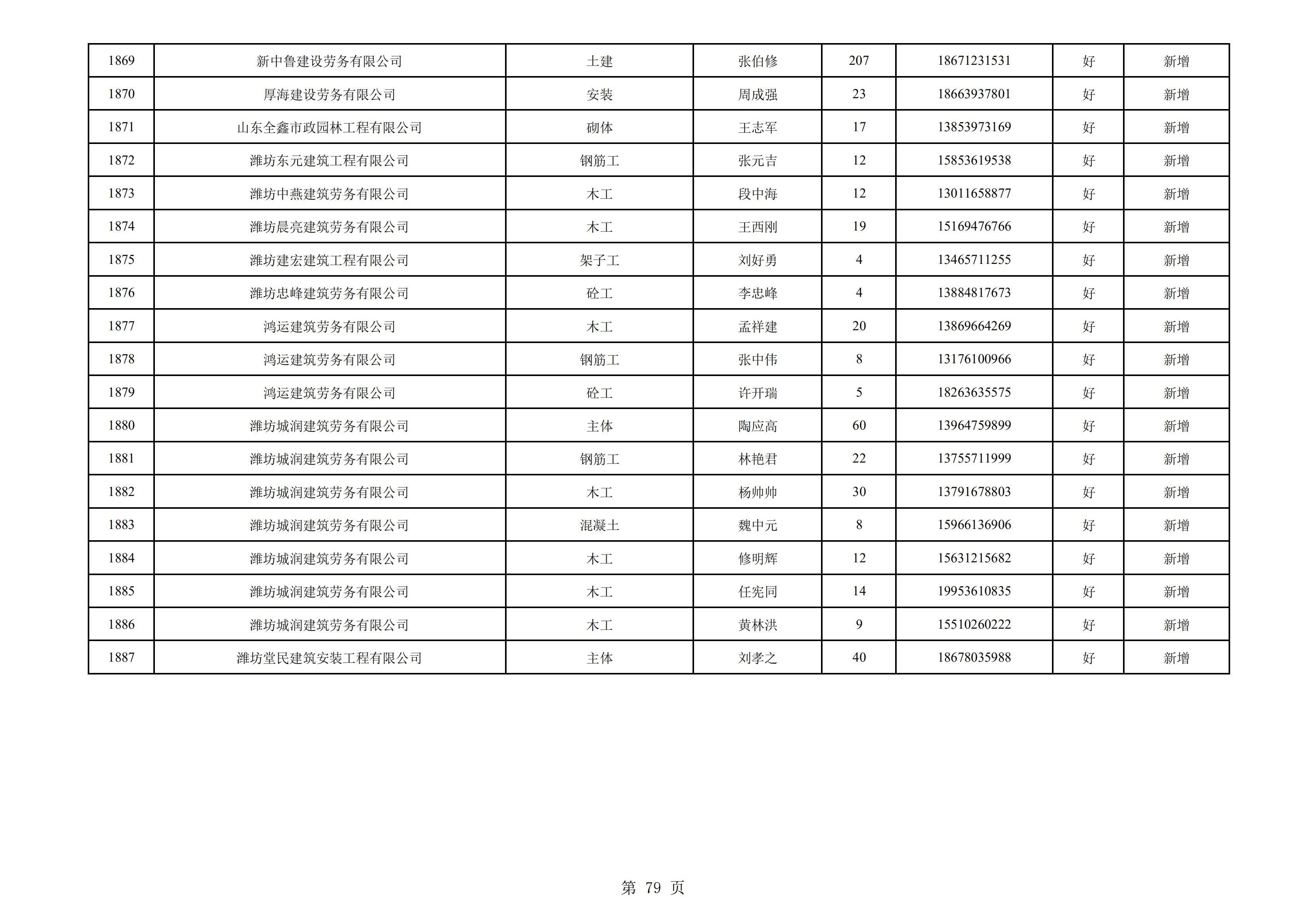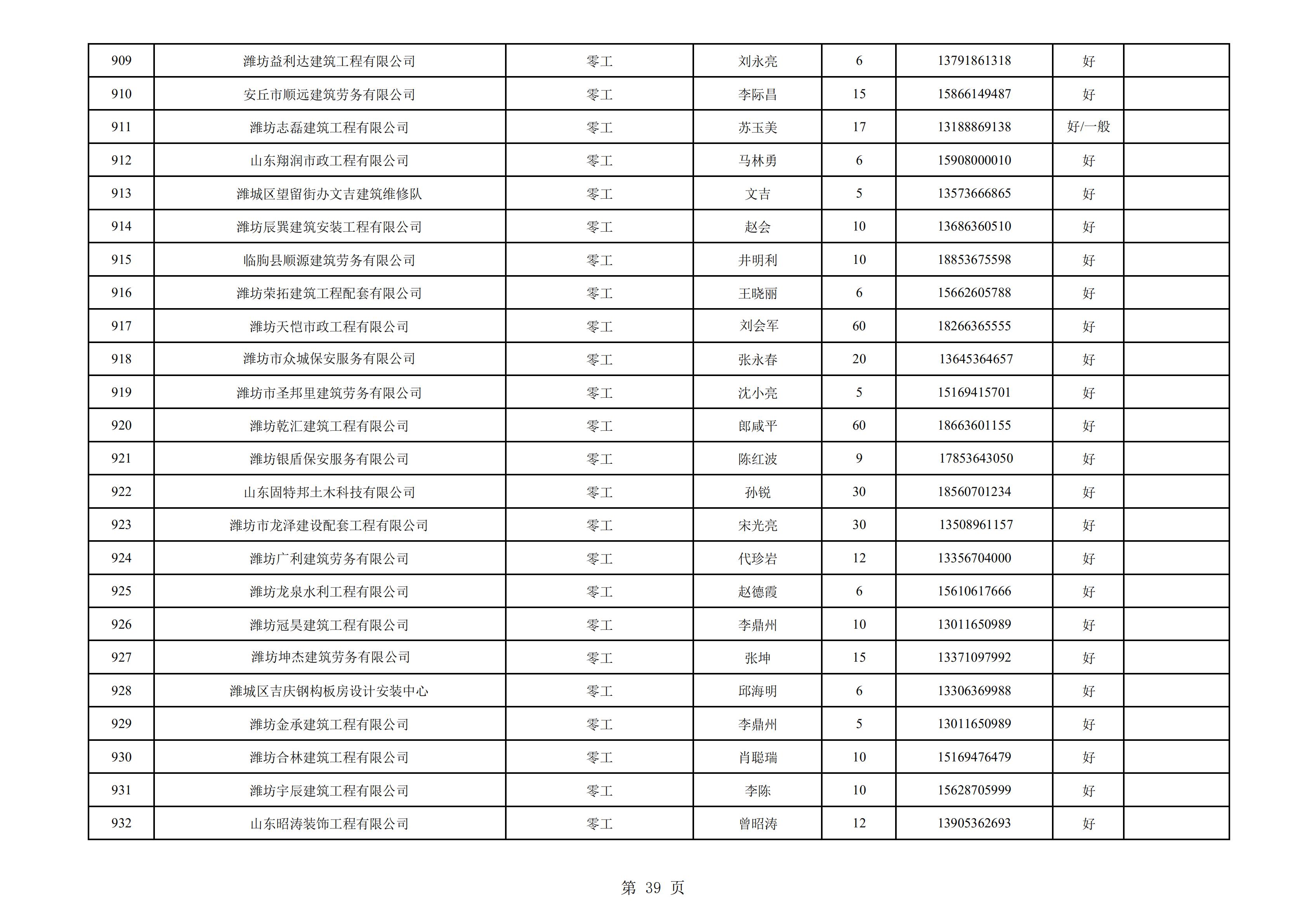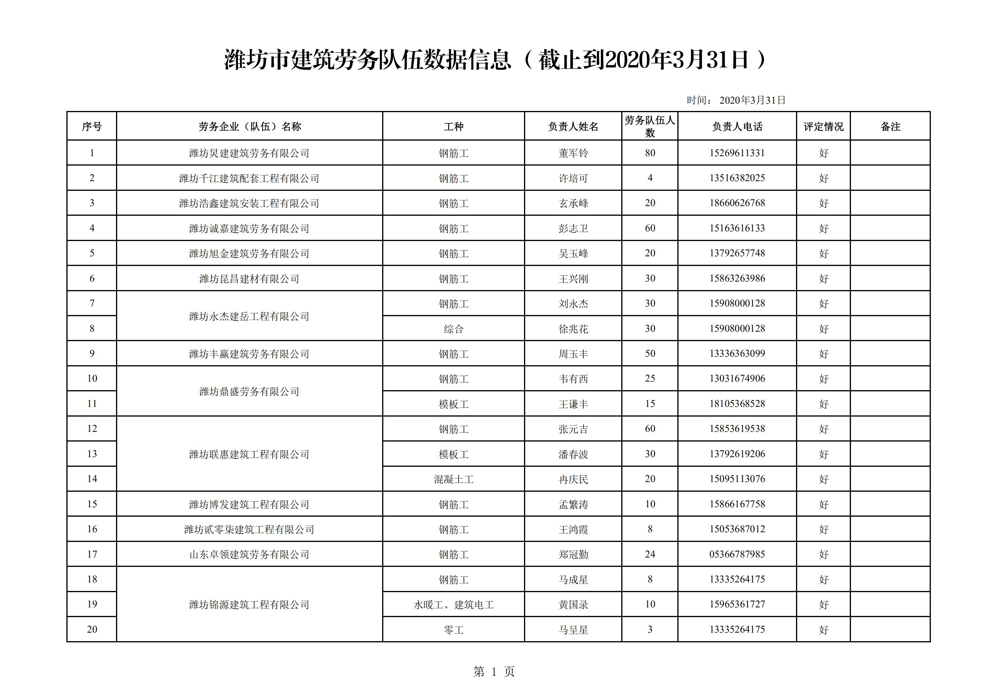 潍坊市建筑劳务队伍数据信息(截止到2020年3月31日)
