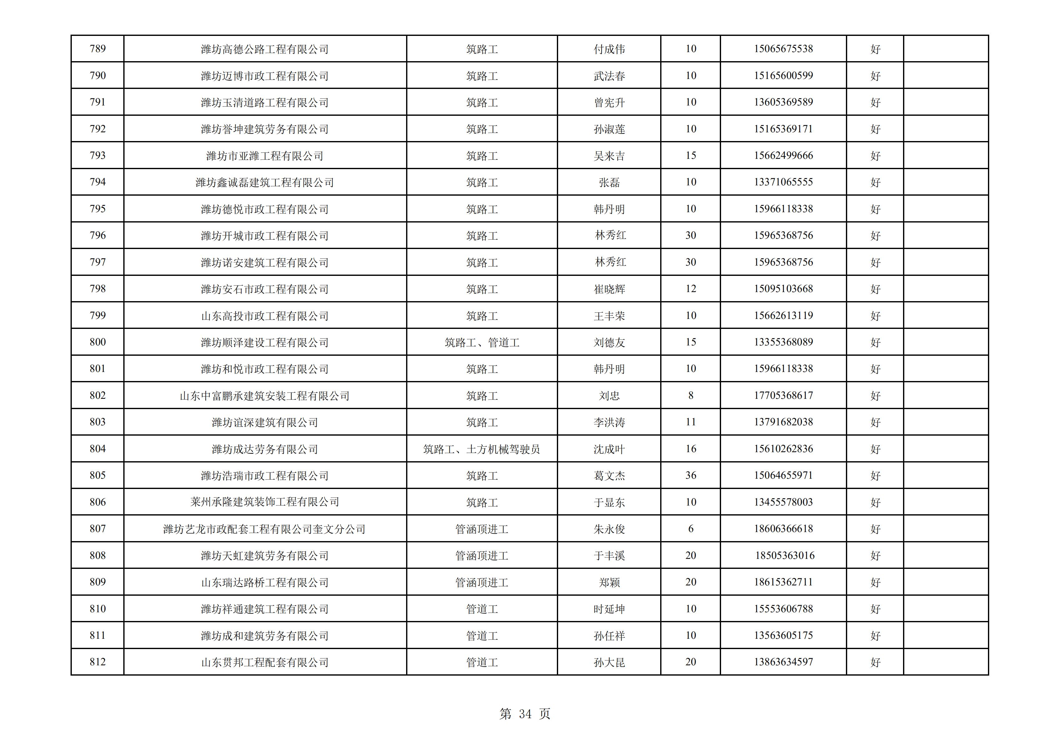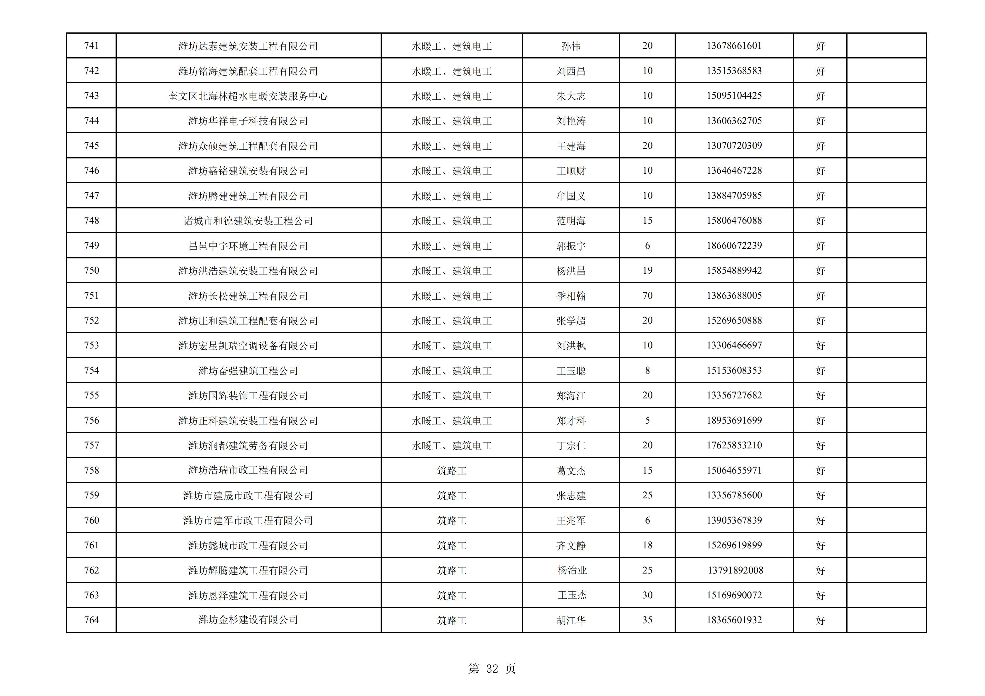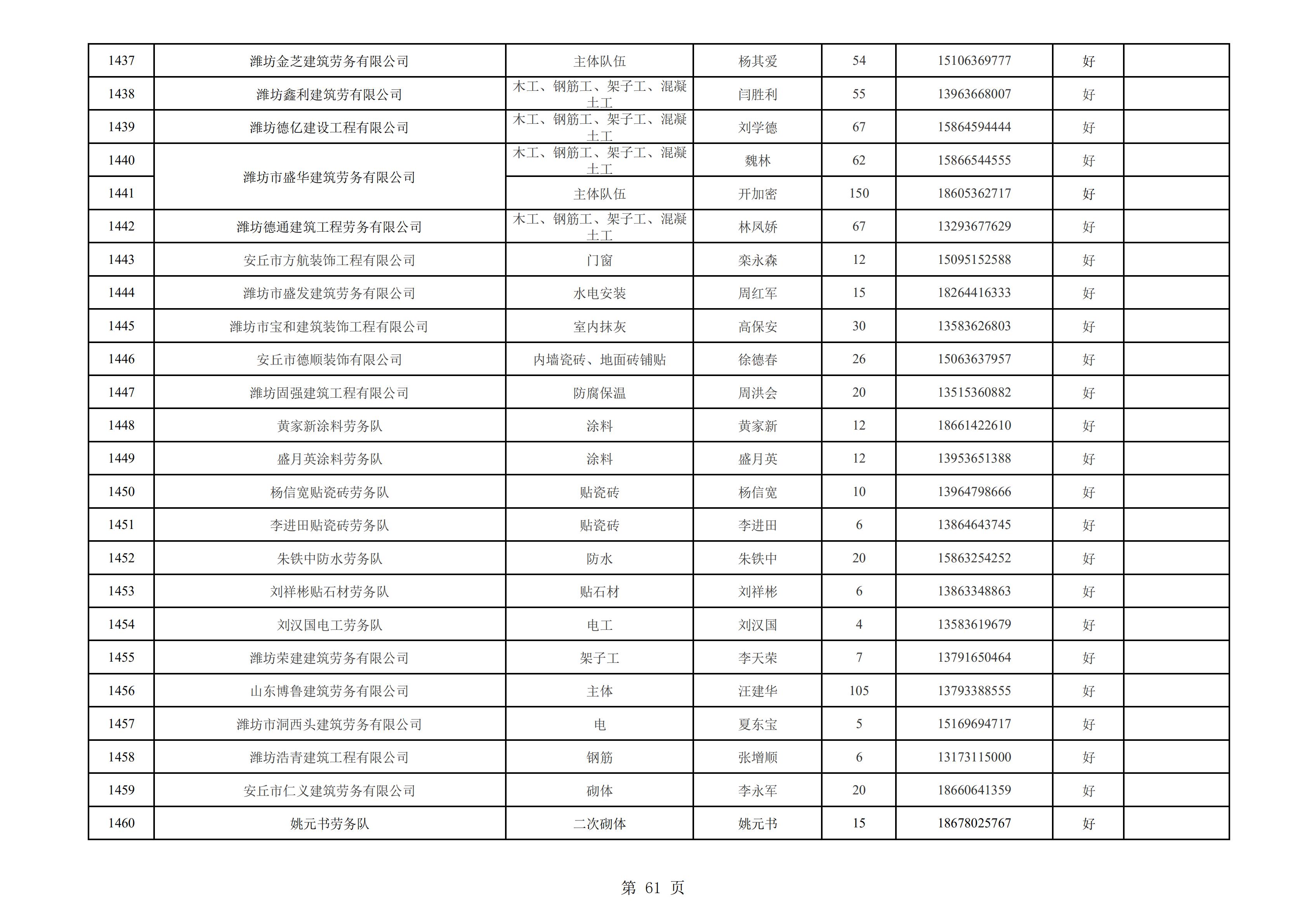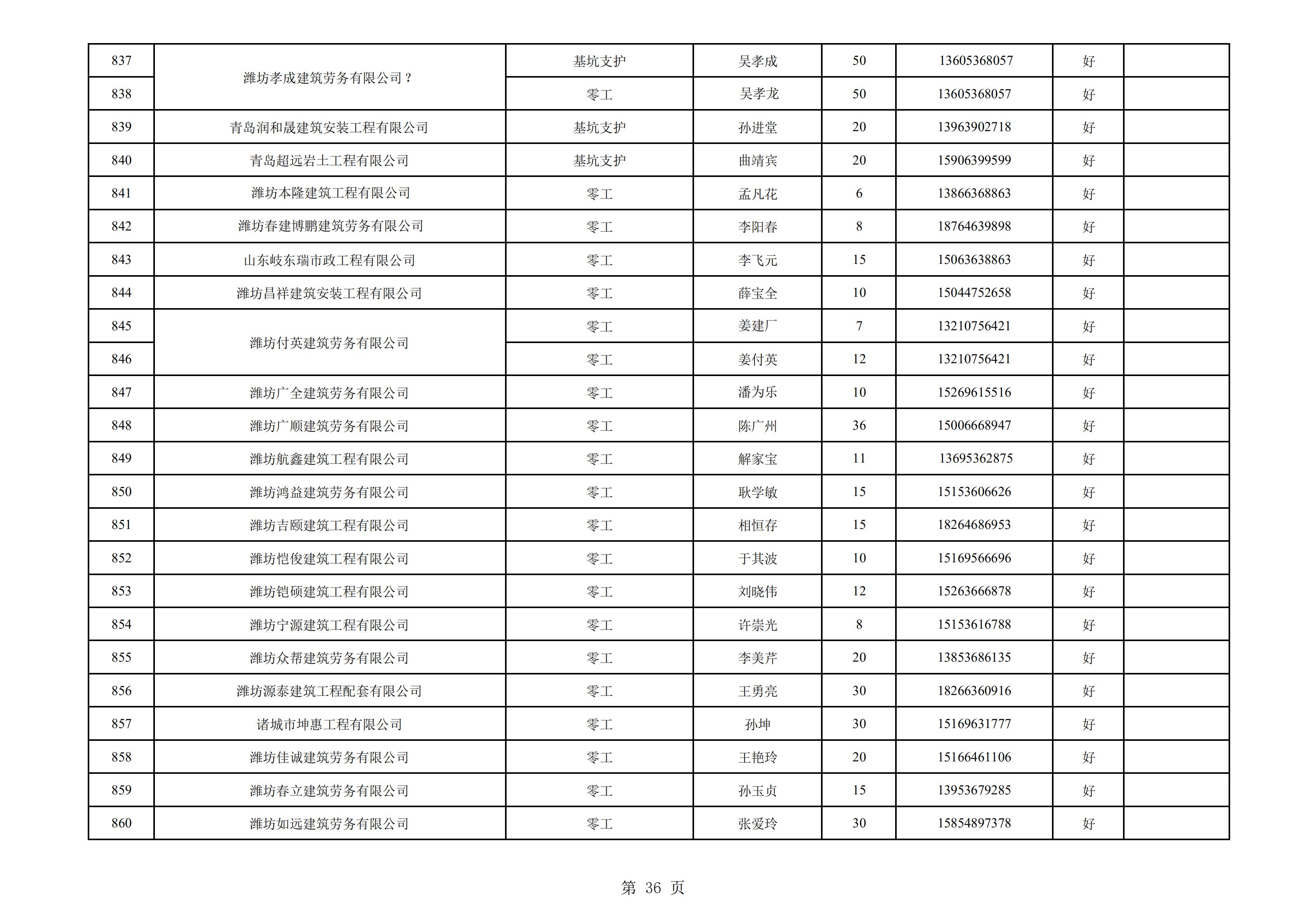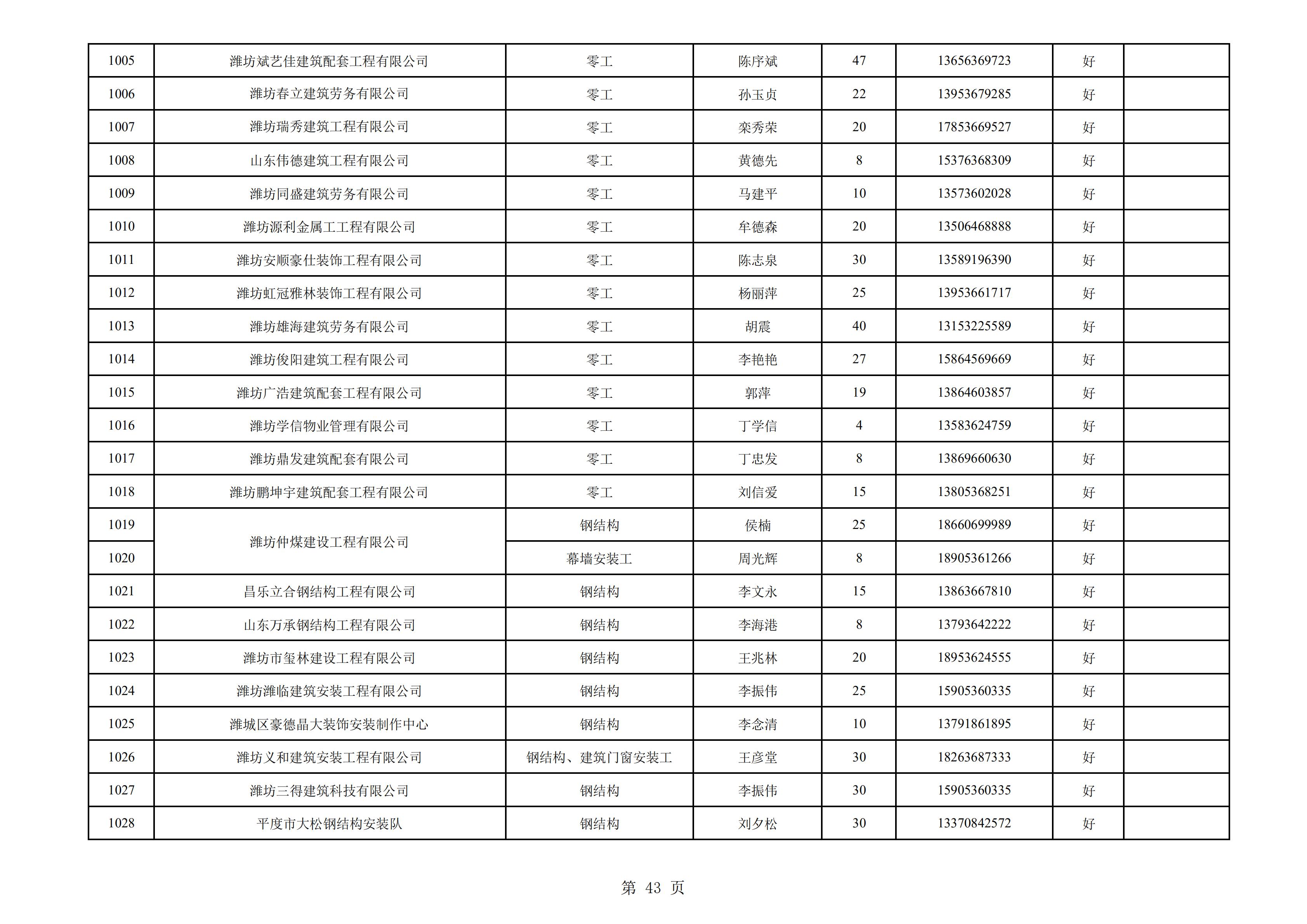 潍坊市建筑劳务队伍数据信息(截止到2020年3月31日)